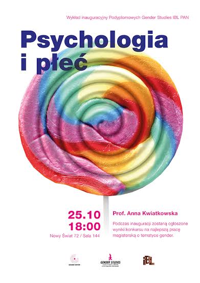 Serdecznie zapraszamy na wykład inauguracyjny Studiów Podyplomowych Gender Studies IBL PAN, który wygłosi prof. Anna Kwiatkowska - "Psychologia i płeć".