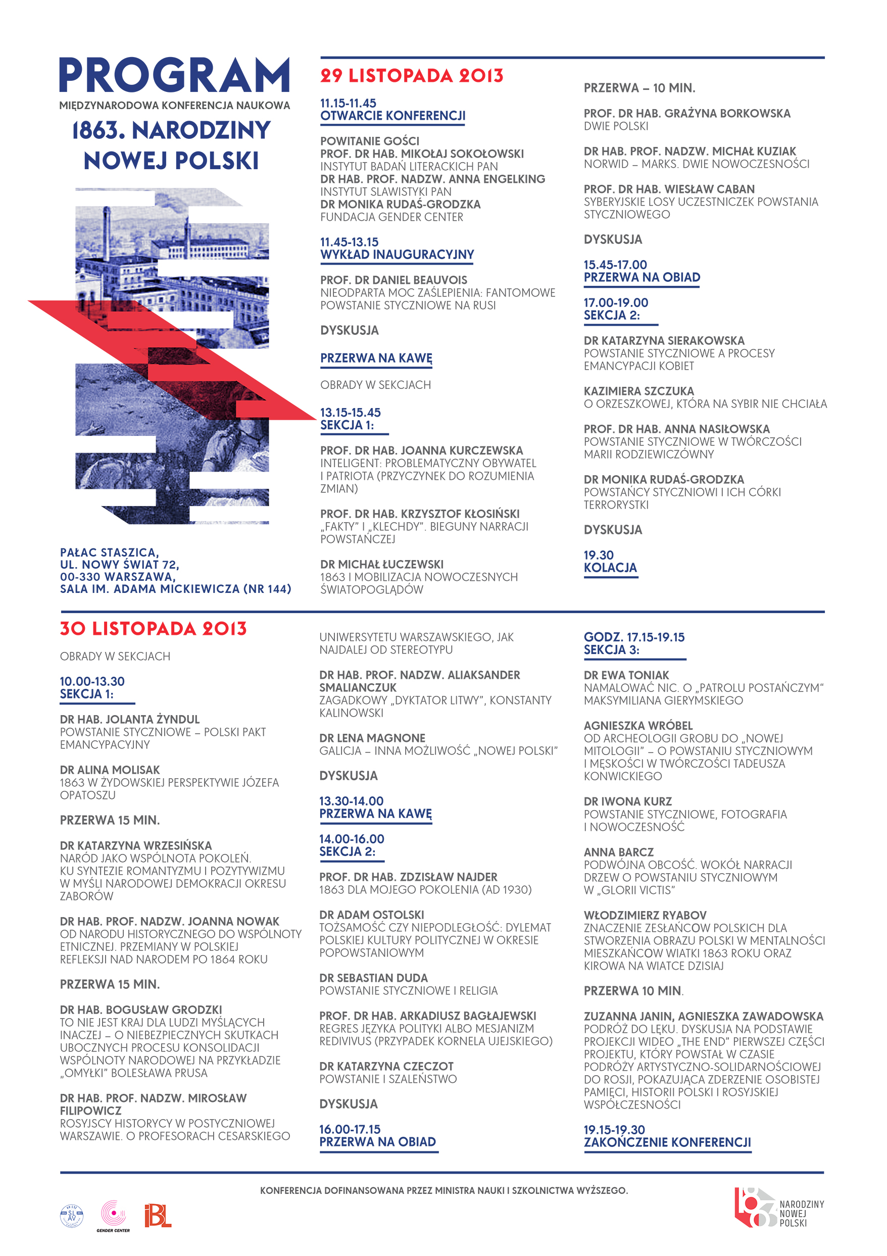 Celem konferencji „1863. Narodziny nowej Polski” jest wprowadzenie do debaty o powstaniu wątków wychodzących poza nierozwiązywalne dylematy: klęska czy zwycięstwo; duma czy gorycz, nękające Polaków od 200 lat. Zgodnie z najnowszymi tendencjami rozumienia doświadczenia historycznego konstruującego państwowość nie tylko w kategoriach walki i klęski, należy także docenić głębokie procesy demokratyzujące i modernizacyjne uruchomione przez wypadki związane z Powstaniem Styczniowym. Pytanie: czy Nowoczesna Polska zaczęła się w 1863 roku prowadzi w nowe rejony myślenia o historii. Stawiamy tezę, że 1863 jest końcem Polski Jagiellonów (feudalnej) i początkiem zmian społecznych, czego świadectwem są narodziny ruchu emancypacyjnego, socjalistycznego, narodowego i ludowego. Wraz z tymi zmianami społecznymi pogłębiła się świadomość narodowa mniejszości etnicznych Ukraińców, Litwinów, Białorusinów. Namysłu wymaga też problematyka asymilacji Żydów i rodzącego się nowoczesnego antysemityzmu. Obszarem naszych dyskusji będą także skutki kulturowe popowstaniowych depresji. Uważamy, że trauma miała wpływ na rozwój tak odmiennych talentów literackich jak Orzeszkowa, Sienkiewicz czy Conrad. Konferencja spróbuje także docenić całą złożoność doświadczenia zesłania, które dla wielu było pierwszym doświadczeniem dalekiej podróży i zetknięciem z innymi obyczajami i językami. Na Syberii i na Kaukazie, zdeklasowani zesłańcy, mężczyźni i kobiety, przeprowadzali pionierskie badania etnograficzne, dokonywali opisów flory i fauny dalekiego wschodu. Aby odpowiedzieć na wyzwania naszych czasów, należy rozszerzyć pole widzenia poza same wypadki wojenne i dostrzec wielopoziomowość dziejącej się historii i nieoczywistość wyborów jej uczestników i uczestniczek. Patrząc na długofalowe konsekwencje powstania widać stamtąd i utratę autonomii i rusyfikację, ale także konfiskatę majątków szlacheckich, kasację klasztorów i przede wszystkim narodziny nowej świadomości. Punkt zwrotny, jakim jest powstanie styczniowe, oznacza przyspieszenie zmian społecznych i demokratyzację życia. Pojawiają się nowe ruchy polityczne: nacjonalistyczne, socjalistyczne i ludowe. Ta Nowa Polska nie została doceniona dostatecznie. Nowoczesne społeczeństwo - w skład którego weszły wszystkie warstwy, zdeklasowana szlachta, ziemiaństwo, mieszkańcy miast, chłopi, mniejszości etniczne - należy łączyć kryzysem ziemiaństwa, końcem feudalizmu oznaczającego powolne znoszenie rzeczywistości nowożytnego niewolnictwa chłopów.